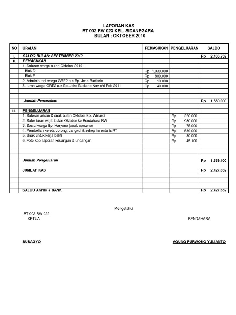 Contoh Surat Laporan Keuangan Kas Rt - No 1 2 3 4 5 6 7 8 9 10 11 12 ju ml ah.. Dan selanjut nya kami dari forum rt.rw ingin menyampaikan laporan keuangan sampai saat ini april 2011, dengan rincian sebagai. Pengeluaran jumlah 1 sisa saldo s/d maret 2012 903.700 1 pmt 12 bln x rp. Jika ingin bukti, warga bisa melihat dalam laporan keuangan kas rt pada website ini. Artikel diatas merupakan kutipan dari: Adapun kondisi arus kas rt.004 rw.07, kami sampaikan pada lampiran pada laporan ini.